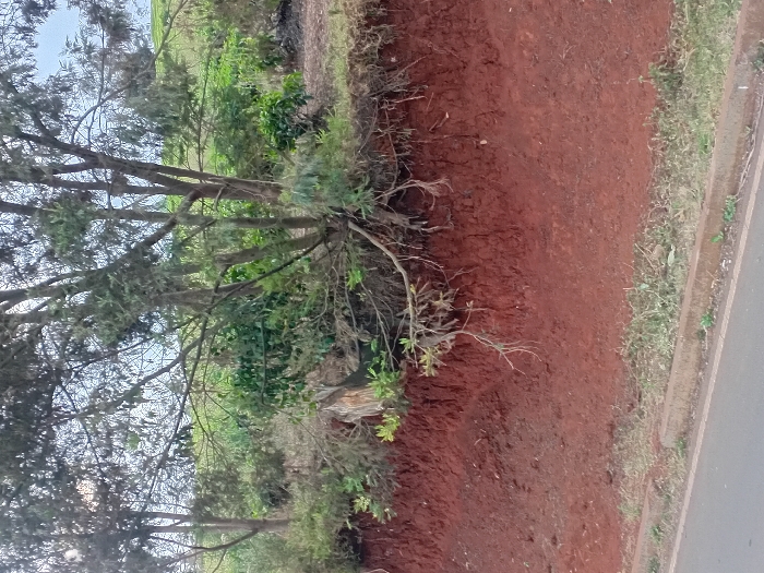 Red soil defines the ground in this landscape. A row of trees, varying in size and leaf density, lines the edge. A paved road and a concrete curb run alongside the soil. Patches of green grass grow near the curb, offering a contrast to the dominant red hue of the earth. The branches of the trees reach across, creating a natural border and adding visual complexity to the scene.