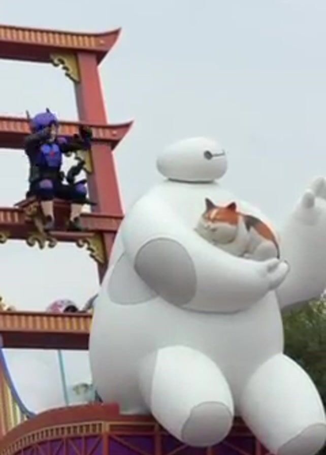 float from a parade. The float is decorated like a Japanese pagoda in red and gold, with a purple bridge connecting two sections. On the pagoda structure, a person dressed as Hiro Hamada from the movie "Big Hero 6" sits in a crouch. Next to the pagoda is a large figure of Baymax from the same movie. Baymax is holding a plush cat. At the bottom of the frame, part of another character's head is visible. The sky is overcast.