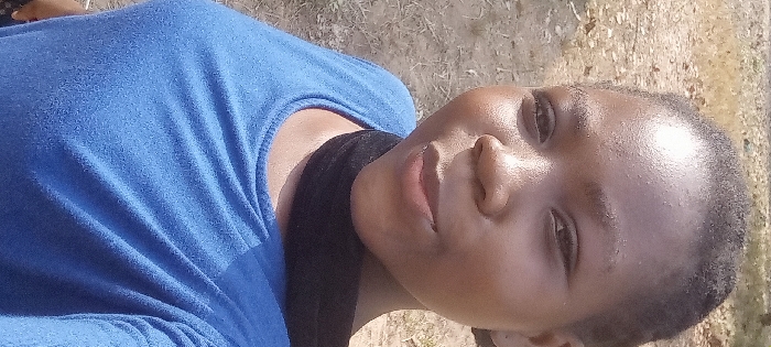 The image displays a close-up portrait of an individual with dark skin, positioned outdoors. The person wears a blue long-sleeved top and a black scarf or neck gaiter around their neck. Their dark hair is pulled back or cut short, and their eyes are open, directed towards the camera. The background is out of focus, showing dry, light brown soil with sparse, dry vegetation and scattered leaves. No specific architectural features or landmarks indicative of the city of Antorun, Nigeria, are visible within the frame. The individual is stationary, posing for the photograph.