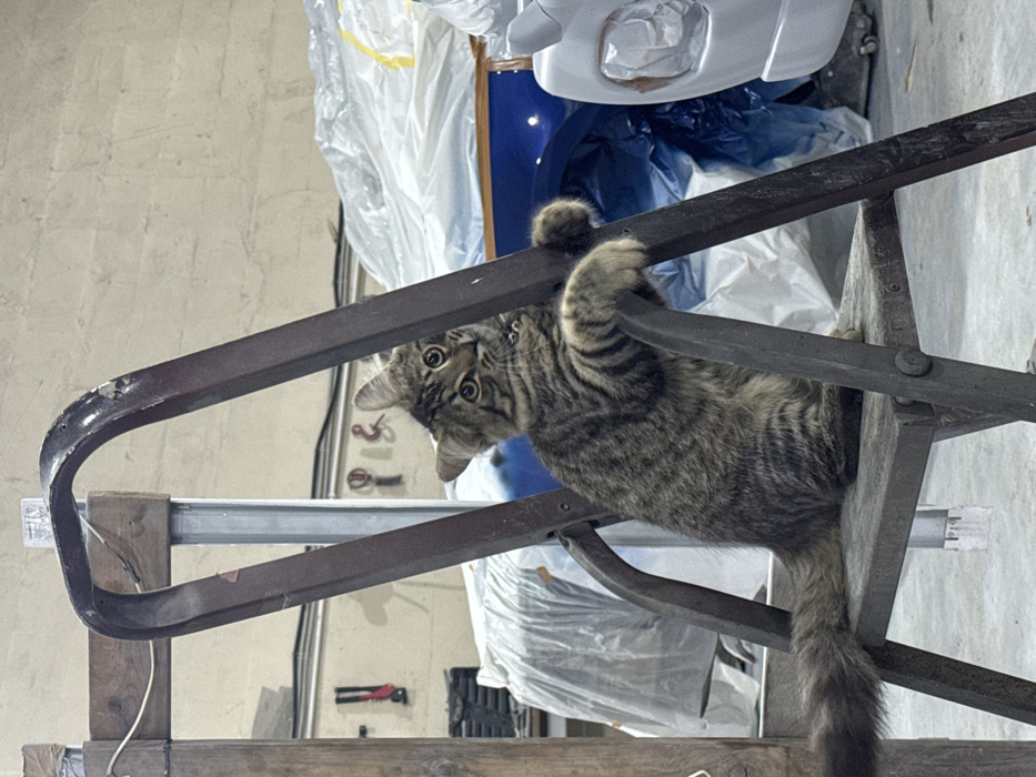 A domestic tabby cat is observed seated on the top step of a dark, folding stepladder within an indoor workshop or garage located in Unknown, Russia. The cat, exhibiting brown and black striped fur, is positioned centrally, facing forward with its head tilted slightly, and its large eyes directed towards the viewer. Its front paws rest on the upper frame of the ladder. A light-colored collar with a small metallic tag is visible around its neck. To the left of the frame, a wooden post and tools, including a red-handled object, are visible hanging on a light-colored wall. To the right and behind the cat, various objects, including a distinct blue automotive panel and a light gray vehicle part (possibly a bumper or fender), are covered with transparent and opaque white plastic sheeting. The floor is a light gray concrete or industrial surface, and the environment is illuminated by overhead artificial lighting.