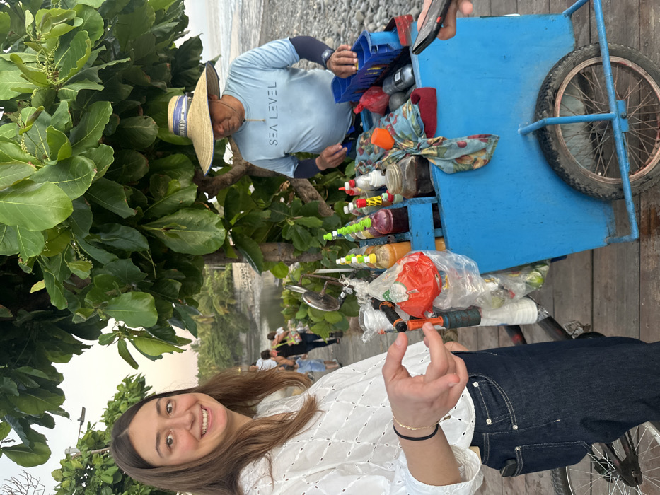 A woman smiles, facing the camera, with dark jeans and a white blouse. Behind her is a man with a straw hat, preparing drinks from a blue cart with various colorful liquids. The cart has a single wheel. Lush green trees frame the scene, and a beach and blurred figures are visible in the background.
