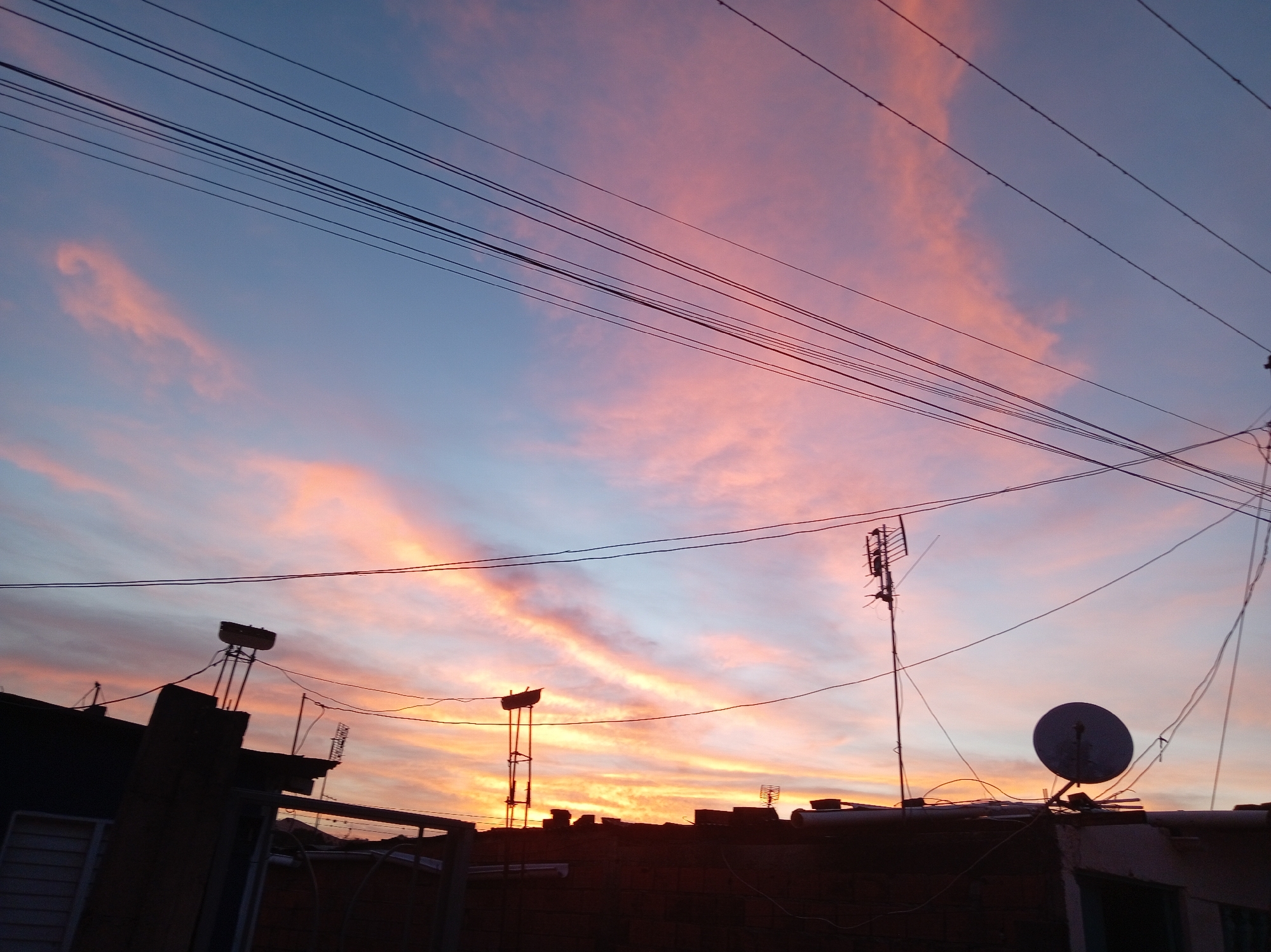 The scene shows an eventide or dawn over the city of Parroquia Ocumare, Venezuela. The sky features stratified colors of deep blue, purple, and vibrant orange-pink, with elongated cloud formations spanning horizontally. Multiple dark utility lines traverse the upper two-thirds of the frame. The lower third presents a dark silhouette of urban rooftops. Prominently visible on the rooftops are various communication and utility structures: a tall, slender support structure topped with a rectangular object on the left, a lattice-style television antenna on a pole in the center-right, and a circular satellite dish on the far right. Additional indistinct structures and wiring are visible across the rooftops. No individuals, specific actions, or interactions are present in the image.