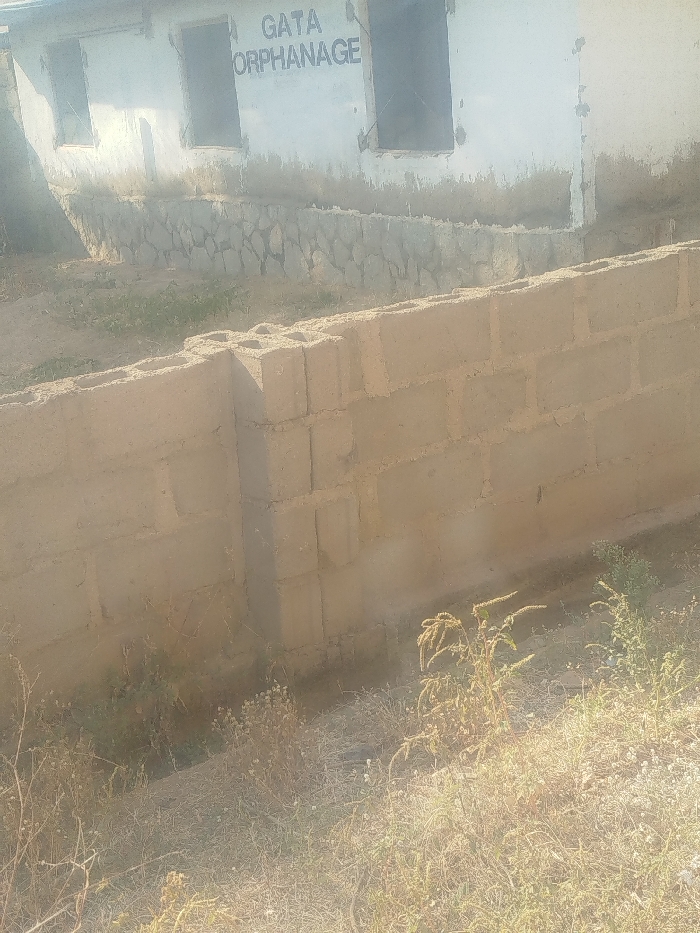 The image displays the exterior of the Gata Orphanage in Akwanga, Nigeria. The orphanage building, visible in the background, is a single-story structure with a weathered, light-colored facade bearing the dark lettering "GATA ORPHANAGE." It features multiple rectangular window openings that appear devoid of frames or glass. The lower portion of the building is skirted with a course of irregular stone masonry. In the foreground, a partially constructed wall, approximately five courses high, is visible. This wall is composed of light-colored concrete cinder blocks, with a vertical column of stacked blocks forming a structural element. The ground between the foreground wall and the orphanage, as well as in the immediate foreground, is dry earth sparsely covered with faded green and brown weeds and dried vegetation. No individuals or discernible activities are present in the scene. The area is illuminated by natural daylight.