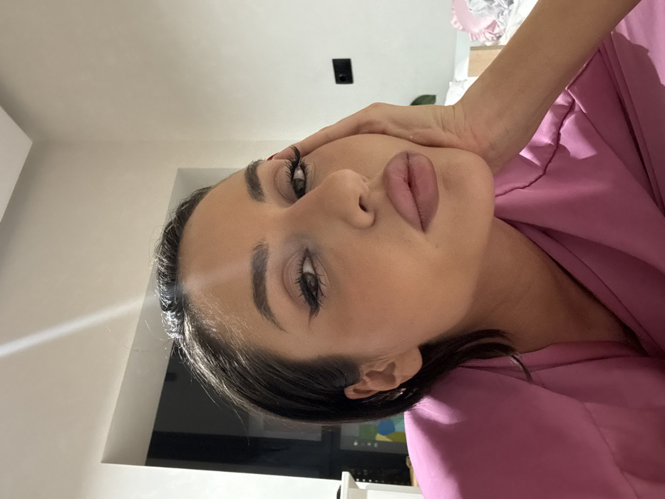A woman with dark hair and fair skin poses with her hand touching her face. She wears a light pink top. Her makeup is natural with defined brows and plump lips. The background includes a light-colored wall, a black electrical outlet, and a glimpse of a monitor screen. The photo is taken at an angle, slightly tilted to the left.