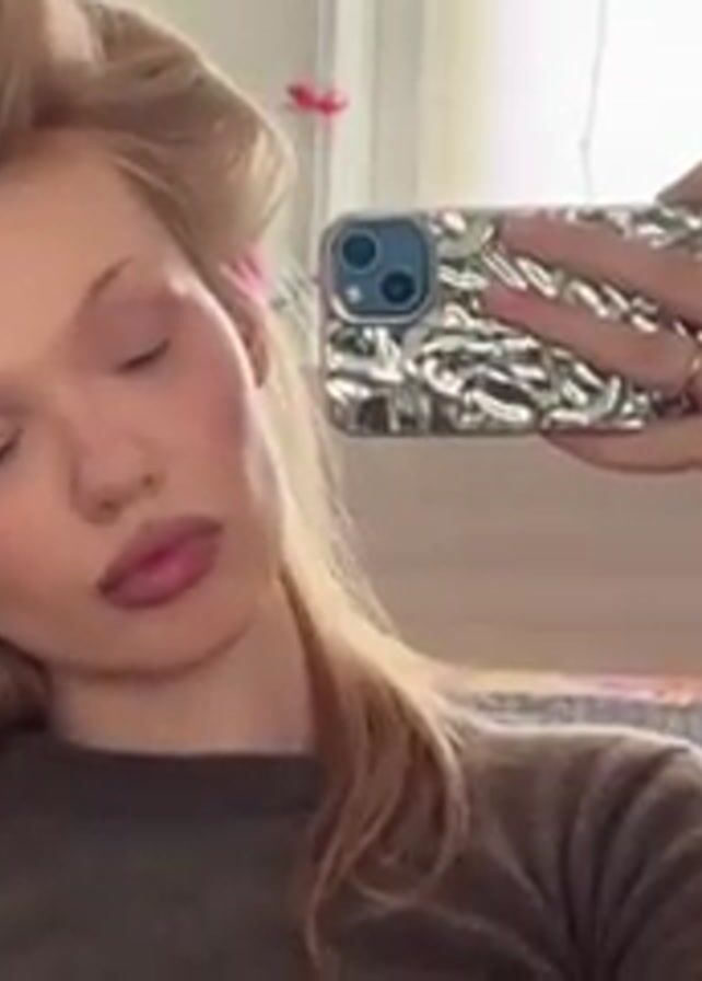 A young woman with fair skin and blonde hair in curlers is taking a selfie in a mirror. She is wearing a brown sweater and a hair tie on her wrist. She sticks her tongue out and makes a kissing face. The phone case is silver and ornate. Behind her is a bed with a patterned blanket and a window with a light curtain. The background is slightly blurred.