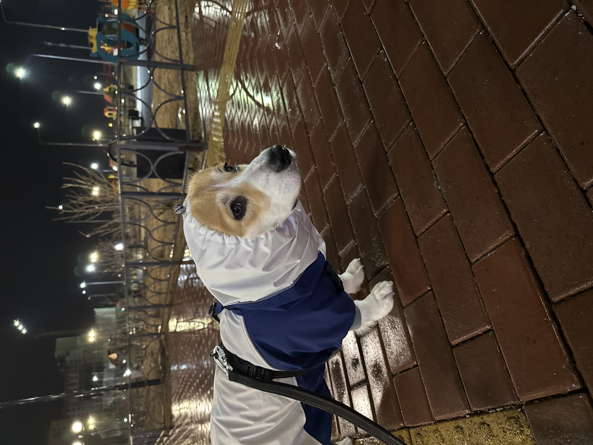 A medium shot depicts a dog in a blue and white rain jacket standing on a brick walkway at night