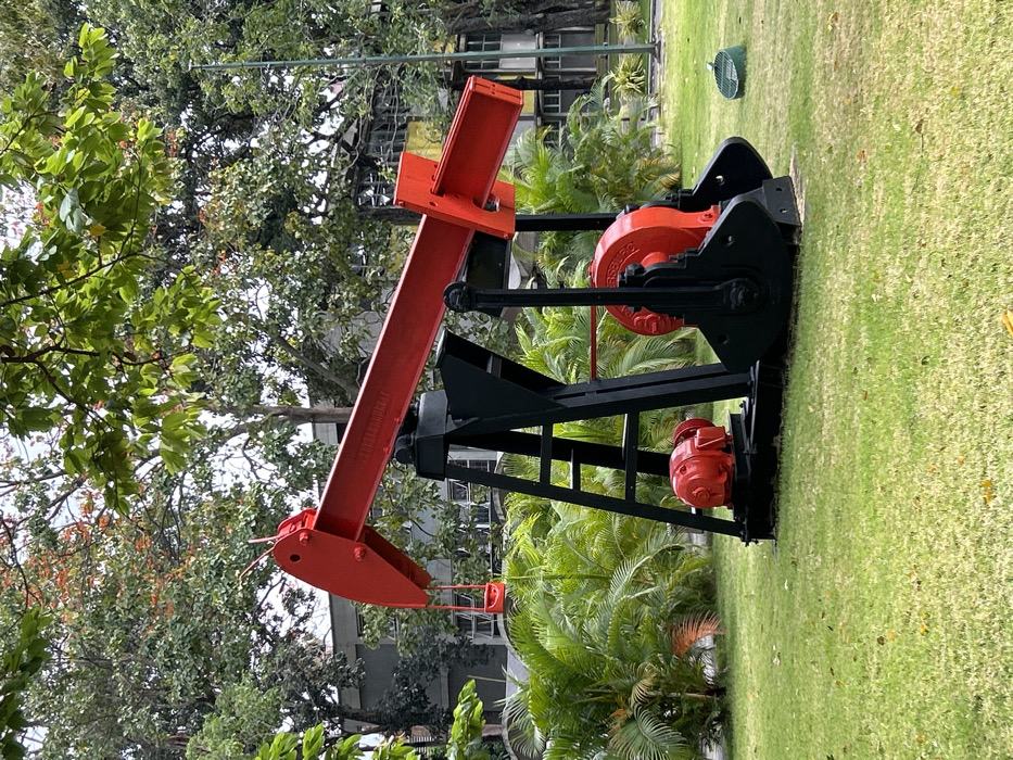 A red and black oil pumpjack stands on green grass surrounded by tropical plants and trees