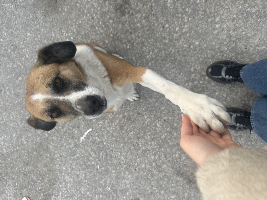 The image displays a tricolor dog and a human hand interacting on a grey asphalt surface in Semchinovo, Bulgaria