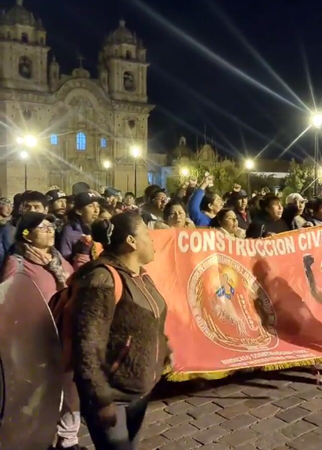 At night, a crowd marches down a cobblestone street with a large red banner that reads "CONSTRUCCION CIVIL DEL" visible. The crowd faces forward and is mixed in age and gender. The bright lights of the city illuminate them and the tall building in the background. At least one police officer is visible wearing a helmet, a vest, and holding a riot shield.