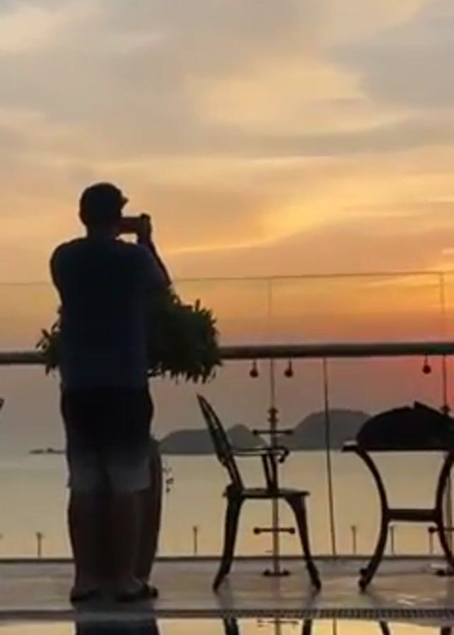 group of people silhouetted against a sunset. There are three distinct individuals discernible. One woman is seated at a table and two men are standing by a glass-paneled balcony railing. One man is holding up a phone and photographing the sunset. The other man is standing and looking out at the sunset, with a cigarette in his mouth. There is a table and several chairs near the railing. The reflection of these figures and furniture can be seen in the pool below. The sky is painted with warm tones of orange and yellow as the sun appears to be setting over the water. Islands are faintly visible in the distance.