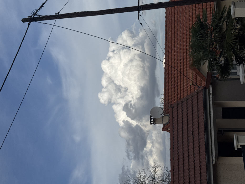 The image depicts an outdoor scene in Orsay, France, under a partially cloudy sky. A large, bright white cumulus cloud mass dominates the upper-center, with darker grey clouds to its sides and clear blue sky visible at the top. In the midground, the terracotta-tiled roofs of two residential structures are visible. On the roof of the leftmost house, a dark-capped chimney and a white satellite dish are present. The facade of this house, partially visible at the bottom left, is light-colored and features a covered entrance supported by pillars. A bare deciduous tree is partially visible on the far left. To the right, another house with a similar terracotta-tiled roof is partially obscured by a palm tree in the foreground. A wooden utility pole, supporting multiple black electrical or communication wires, stands vertically on the far right, with wires extending horizontally across the upper frame. No people or specific actions are discernible.