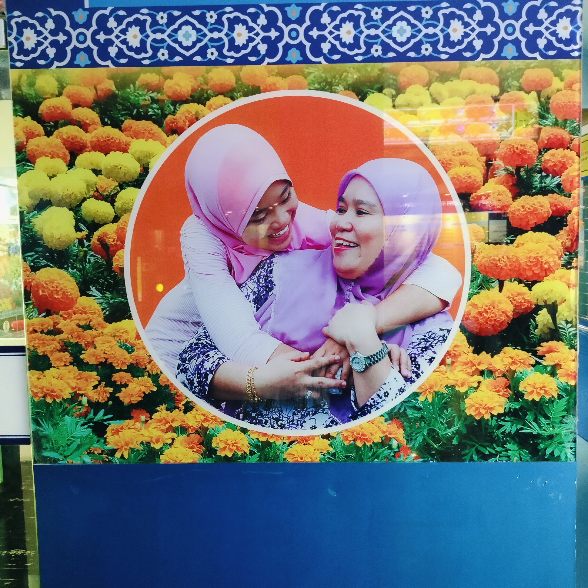 poster with a circular inset featuring two women embracing. Both women are wearing headscarves, one pink and the other lavender. The woman in the pink headscarf is smiling and has her arms wrapped around the other woman. The background of the inset is orange. Outside the circle, the poster shows a field of orange and yellow marigolds with green foliage. The top of the poster has a blue and white decorative border. The bottom of the image shows a blue surface, possibly the surface on which the poster is displayed. The city of Dhaka, Bangladesh is not evident in the image.