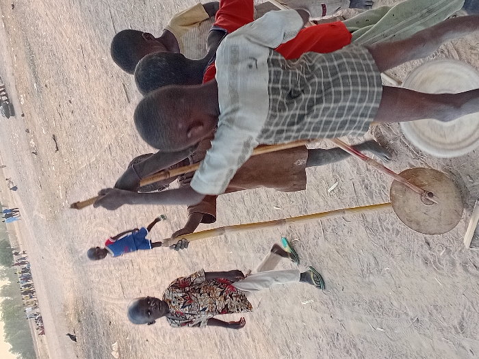 Several young boys are playing in a sandy area with improvised toys. They are using sticks and what appear to be circular metal or plastic discs as wheels. Some boys are holding the sticks while others are seemingly riding or pushing the wheeled contraptions. A crowd of people stands in the background. The children's clothing varies, with some wearing patterned shirts and trousers. The scene suggests a playful and resourceful activity, possibly a handmade race or game.