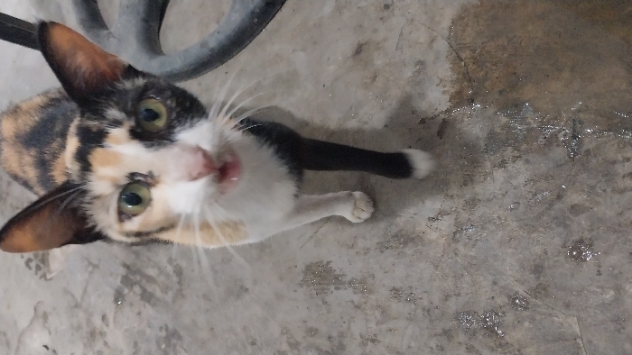 A close-up depicts a calico cat, viewed from above, with light green eyes and a partly open mouth revealing a pink tongue. The cat has a white chest and a black arm with a white paw. Its fur is a mix of brown, black, and white markings. The cat is positioned on a gray concrete surface with damp spots, and a blurred dark gray object appears in the upper left corner.