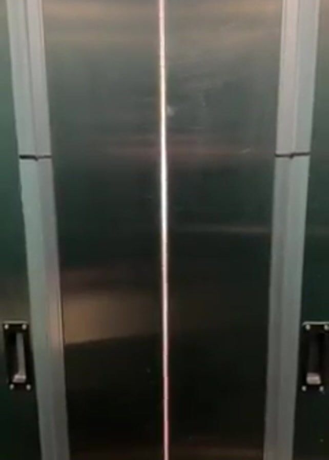 automatic doors of a commercial elevator opening. The doors are made of shiny steel with gray edging and black handles. The interior walls behind the doors are dark green. As the doors slide open, a light pink grid-like pattern is revealed in the crack between the doors.
