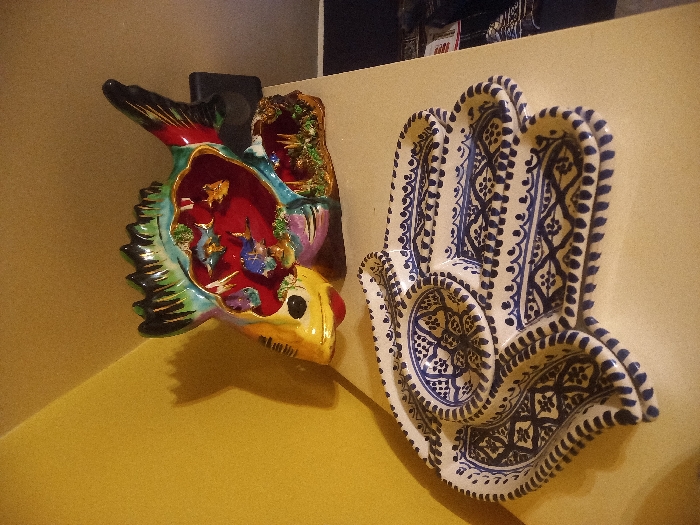 A colorful ceramic fish wall decoration features an open interior with small figures. Adjacent to it is a ceramic Hamsa hand, intricately decorated with a repeating blue and white pattern. Both items are mounted on a light yellow wall. A blurred background shows additional items, partially obscured. The fish faces towards the left, while the Hamsa hand faces right.