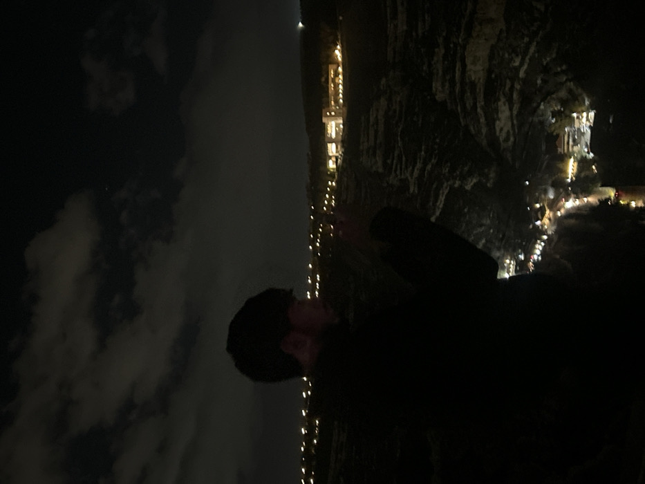 The image displays a nighttime scene in the city of Dummar Municipality, Syria, viewed from an elevated position. A single individual, appearing as a dark silhouette, stands in the left foreground, facing right and looking out over the illuminated landscape. This person, an adult male, has their right arm slightly raised with the hand near their chest, possibly holding an object. The environment consists of a dark, cloudy sky above a vast expanse of land dotted with numerous artificial lights from a settlement below. In the mid-distance to the right, a prominent, well-lit multi-story building complex is visible. Further down the slope, a winding road with discernible vehicle lights indicates active traffic. Other scattered lights from buildings and streets extend across the lower section of the image, outlining a populated area against the dark terrain. No direct interactions between individuals are discernible.