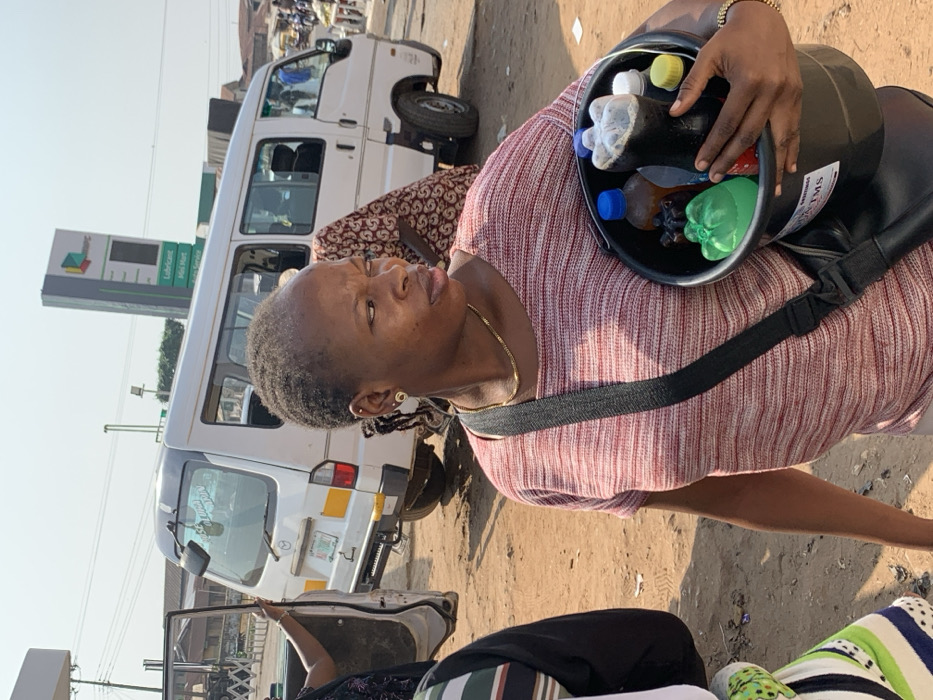 A daytime street scene unfolds in Oyo, Nigeria, under a clear sky. In the foreground, an adult woman with short dark hair, wearing a horizontally striped light red and white short-sleeved top, a thin gold-colored chain, and light-colored circular earrings, carries a black bucket. The bucket, marked with a white "DOT/TMS" sticker, contains several plastic bottles filled with various liquids, including a prominent green-colored bottle and multiple darker-liquid bottles. A black strap, likely from a bag, crosses her torso. Her gaze is directed towards the right side of the frame. In the mid-ground, to the left, a white commercial minibus, bearing a Nigerian license plate with "OYO" visible and a faded "GLORY OF GOD ALONE" sticker on its rear window, is parked on unpaved light brown earth. Its rear passenger door is open, revealing a partially obscured individual inside. Another person in a patterned garment is partially visible behind the foreground woman, adjacent to the minibus. Further back on the right, a tall green and white NNPC fuel station sign stands, listing "Lubricant" and "Mini Mart." Distant buildings and a bustling street environment with other vehicles and people are visible under the clear sky, suggesting an active urban or commercial area.