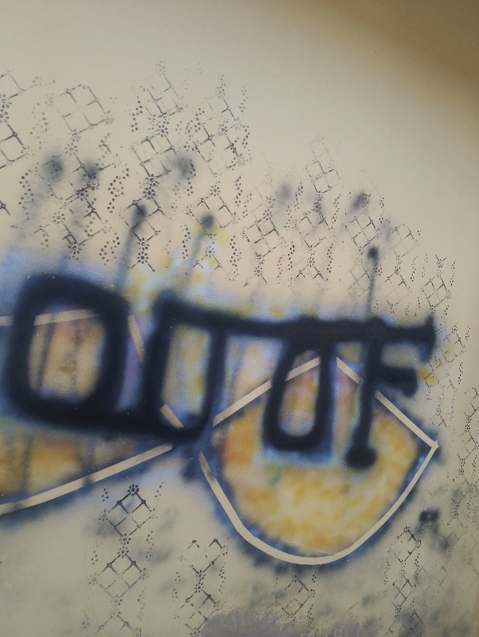 A stylized graffiti image displays the blurred letters "OUUF" in dark blue on a textured, pale background