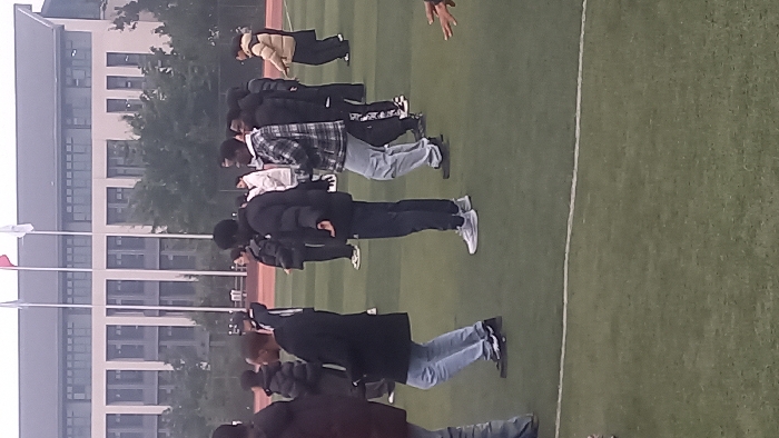 A group of people standing on a green field next to a building. Some are facing to the left, and some are facing to the right. Most are wearing dark jackets and pants, but a few are wearing lighter colors. There is a white line on the field, and a person's hand is partially visible in the top right corner. The overall impression is of a casual gathering or training session.