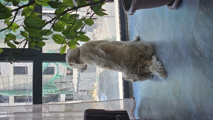 A light-furred golden retriever dog is seated on a patterned light grey floor, facing outwards through a multi-paned window