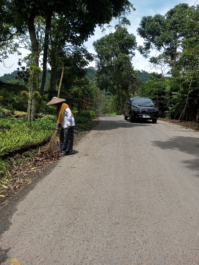 The scene is located in Ariyalai, Sri Lanka. The image displays a paved asphalt road flanked by dense tropical vegetation and tall trees under a partly cloudy sky. In the foreground, on the left side of the road, a person wearing a wide-brimmed straw hat, a light-colored long-sleeved shirt, a mustard yellow head covering, and dark patterned trousers is actively sweeping dried leaves and debris from a grassy verge onto the asphalt using a natural fiber broom. Further down the road on the right, a dark-colored SUV, identifiable as a Toyota Innova, is parked or slowly moving, facing away from the viewer. Its license plate shows "P 1XX 7Y". The background reveals lush, tree-covered hills or mountains. The environment is outdoor, characterized by abundant greenery and natural light.
