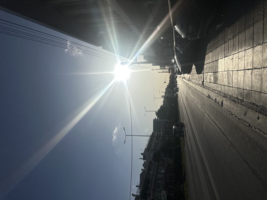 The image captures a sunlit urban street in Agia Paraskevi, Greece, during daytime. The sun, prominent in the upper right quadrant, produces strong lens flare and backlighting, casting long shadows and silhouetting elements on the left. The sky is clear blue with a faint wispy cloud near the center-left. A multi-lane asphalt road occupies the center and left foreground, extending into the distance. Double solid white lines are visible on the road surface. Multiple vehicles, including several cars and at least one scooter or motorcycle, are in motion along the road. To the right, a tiled pedestrian sidewalk runs parallel to the road. Approximately five passenger vehicles are parked bumper-to-bumper along the right curb of this sidewalk. The sidewalk tiles reflect the intense sunlight. On the left side of the road, a series of multi-story buildings, likely residential or mixed-use, are discernible, heavily silhouetted against the bright sky. These structures feature balconies and various rooftop fixtures. On the far right, a portion of a larger, darker building is visible, also silhouetted. Overhead, several utility lines traverse the upper right of the frame. Multiple streetlights with dual luminaires are spaced along both sides of the road. No individuals are clearly identifiable within the scene.