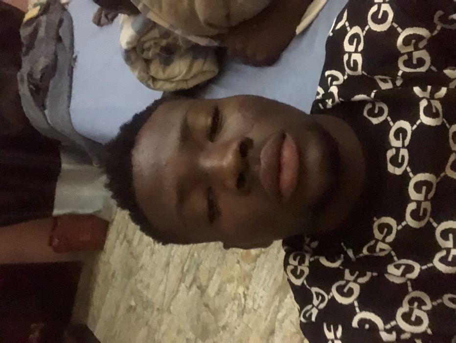 A Black man lies on his back, eyes closed, wearing a black shirt patterned with interconnected white "G" logos. A blue pillow and a folded patterned blanket are visible above his head. Part of a reddish-brown object is present in the lower left corner, possibly another pillow or object on the floor. The background is textured and appears to be a light-colored flooring material.
