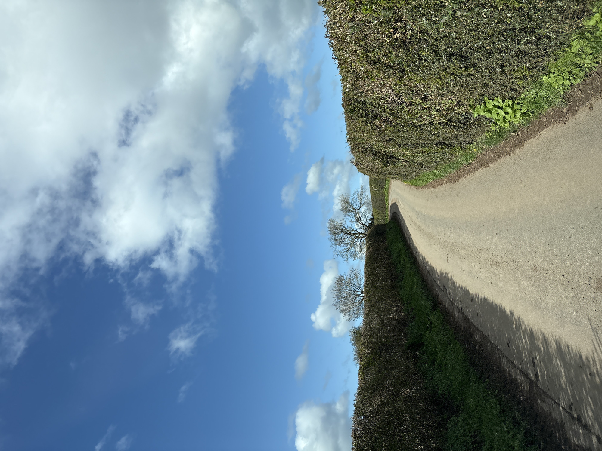 A narrow, unpaved rural lane in Pulverbatch, United Kingdom, extends into the mid-distance, curving gently leftward. The lane's surface is light brown/tan, with shadows from an unseen source to the right falling across it. Dense, dark green hedgerows line both sides of the lane, exhibiting varied foliage density; lighter green ground vegetation is present at their bases. Above the left hedgerow in the mid-ground, several bare deciduous trees are visible against a bright blue sky dotted with scattered white cumulus clouds. No individuals, animals, vehicles, or man-made structures are present within the frame.