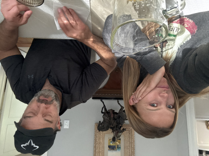 A man and a woman sit at a table. He wears a black shirt and a baseball cap. His hands rest on a white napkin. She wears a gray sweatshirt and a decorative pitcher sits in front of her. They are posed for a selfie in an interior room. A bronze statue and a framed painting are visible behind them. The image has been rotated 180 degrees.