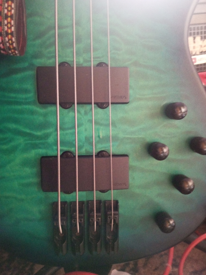 A close-up shot features the body of an electric bass guitar. The guitar has a vibrant green wood grain finish. Four strings stretch across two black pickups. Each string terminates at an individual saddle on the bridge. Five dark knobs are arranged in a triangular pattern on the right side of the body. A strap with a colorful woven pattern is visible at the top left edge.