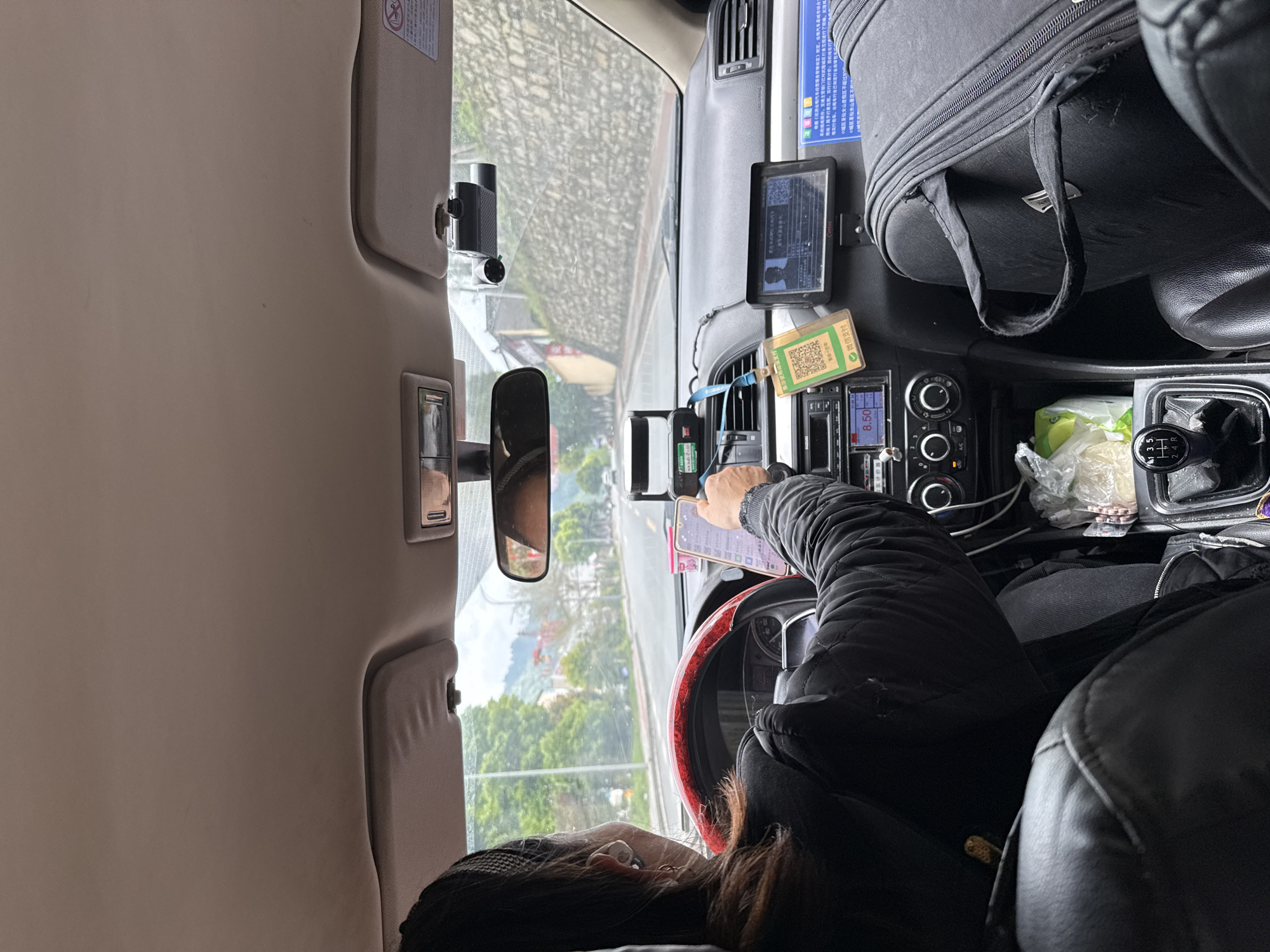 Captured from inside a vehicle, the image presents a view of the driver, a person with dark hair and wearing a black quilted jacket, focused on a smartphone. The setting appears to be the Wulong District, China, as suggested by the landscape visible through the windshield. The vehicle's interior includes a dashboard cluttered with various items like a driver identification display, a QR code tag, climate control dials, a gear shift, and a bag of tissues. Additionally, a black travel bag is positioned on the passenger side. Outside the vehicle, the cityscape consists of tree-lined streets and a backdrop of hills or mountains, indicating an urban or suburban environment.