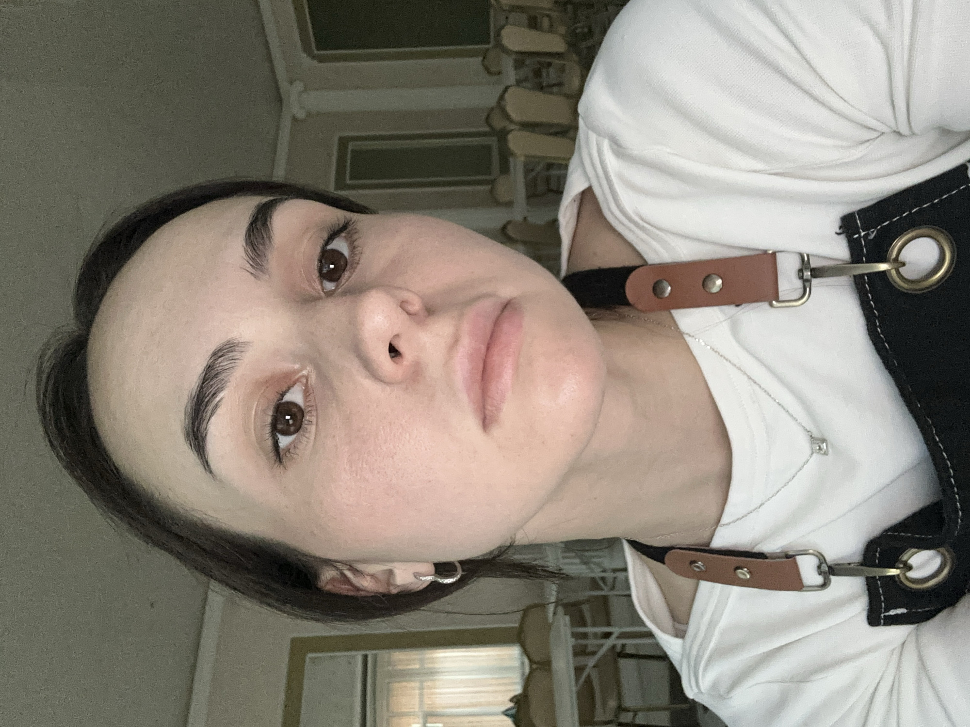A person, likely a young woman, is captured in a close-up, tilted selfie