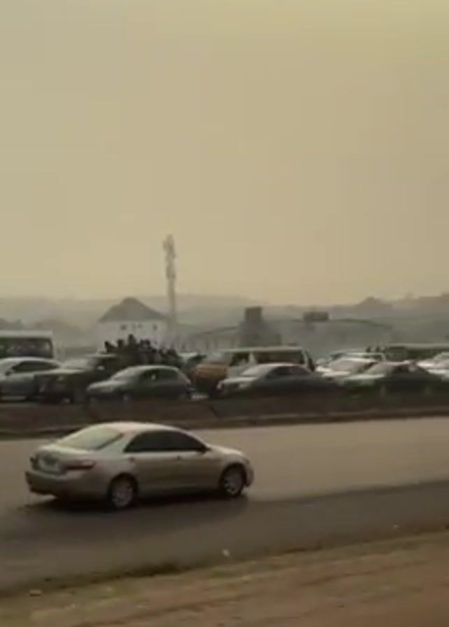 busy road in an urban setting on a hazy day. The sun is shining, but the visibility is poor. There are cars, buses, and a van parked on the side of the road. A man walks along the side of the road carrying something on his head. A motorcycle passes the man. A red Volkswagen Golf drives down the road. In the background, there is a building, a tower, and some piles of dirt.