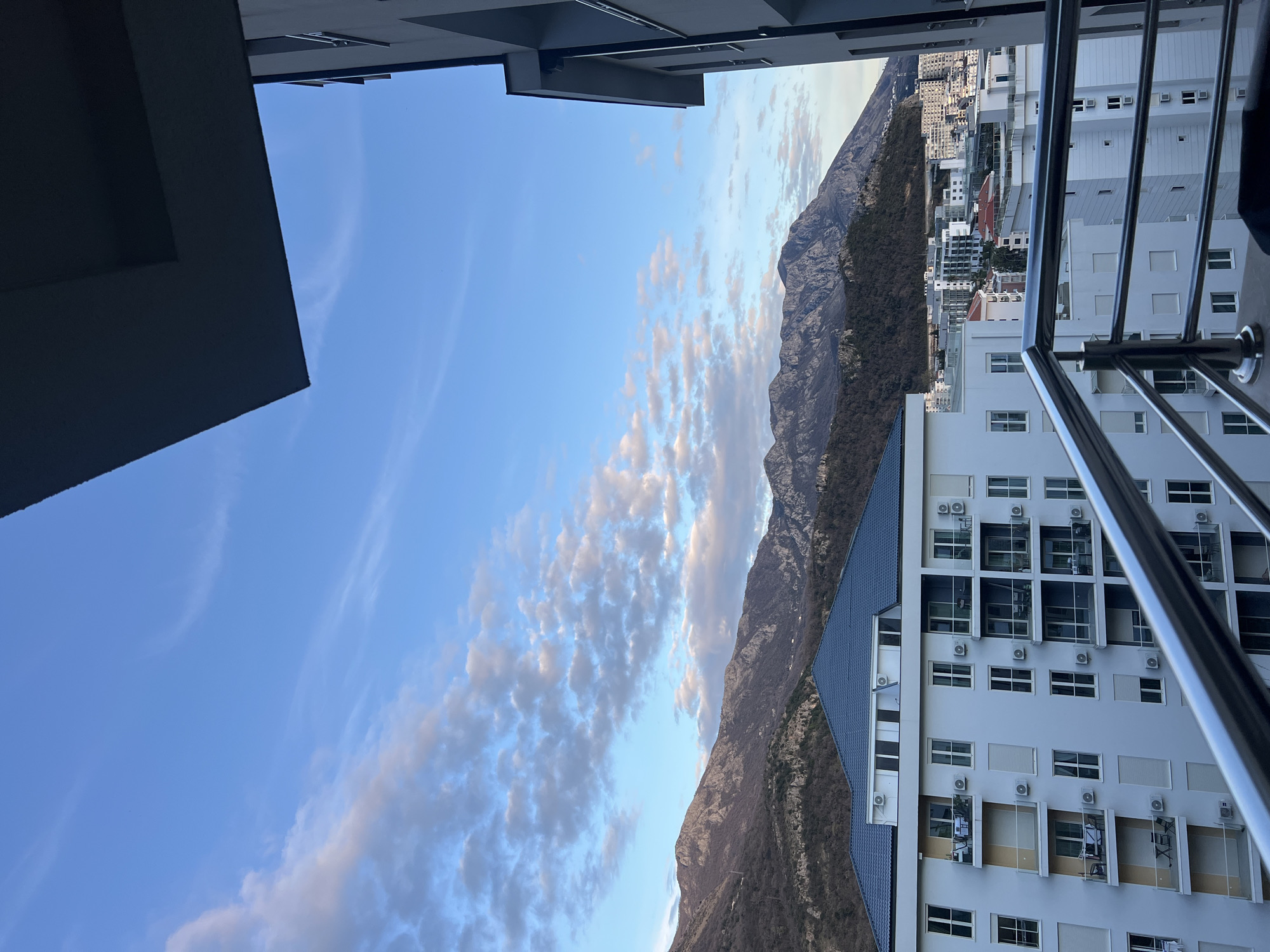 The image captures a view in Boreti, Montenegro, framed by the architecture of buildings. A mountain range dominates the central view, partially covered with trees and shrubs. The sky is blue with scattered altocumulus clouds. The right side of the frame shows the facade of a white building with many windows and air conditioning units. A chrome balcony railing is in the foreground. Part of a grey building extends into the frame from the left and top. The built environment of Boreti is visible in the distance.