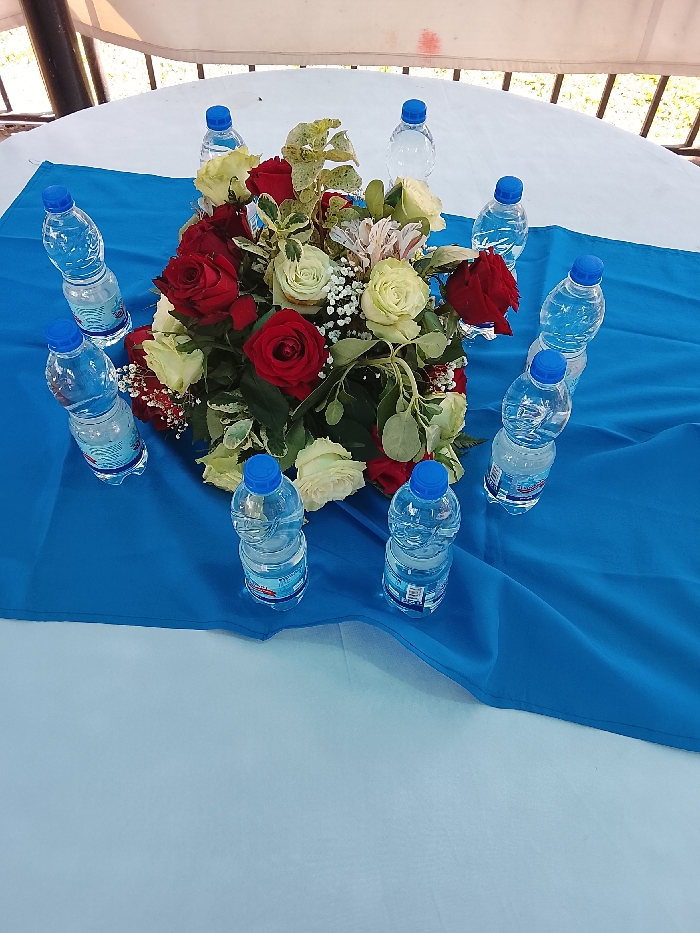 Centered on a white tablecloth is a vibrant floral arrangement of red and white roses with lush greenery. Surrounding the bouquet are several clear plastic water bottles, each with a blue cap, arranged symmetrically around the flowers. The bottles sit on a blue runner placed on the white cloth. The scene is well-lit and appears to be outdoors, possibly under a covered area, given the soft, ambient light.