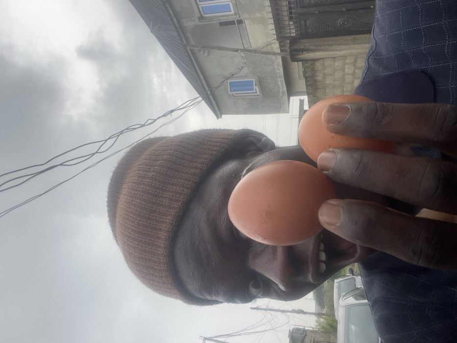 A close-up photograph taken in Langbasa, Nigeria, depicts a dark-complexioned male individual from the upper chest upwards, positioned against an urban backdrop under an overcast sky. The subject wears a brown knitted beanie and a dark blue collared shirt with a subtle white checkered pattern. He holds two intact brown chicken eggs with his right hand; one egg is prominently positioned in the foreground, obscuring his left eye, held between his thumb and forefinger. The second egg is held further to the right between his middle and ring fingers. His facial expression includes wide-open eyes and an open mouth, conveying a direct, expressive gaze towards the camera. In the background, under a uniformly grey sky, utility wires span horizontally across the upper frame. A light-colored vehicle is partially visible on the far left. To the right, a two-story, unpainted concrete building with a dark-tiled roof features multiple windows, some with blue frames, and a dark gate at its base, fronting a concrete block wall.