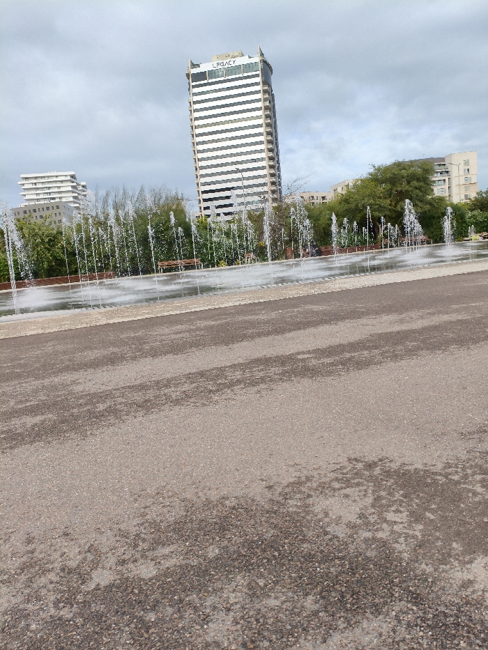 A row of water fountains shoots up from a horizontal pool, backed by green trees and a city skyline. The tallest building, labeled "Legacy," is a white, rectangular tower with horizontal stripes. A cloudy sky hangs above. The foreground features a grey, grainy pavement, speckled with darker patches. The image is taken at a slightly tilted angle.