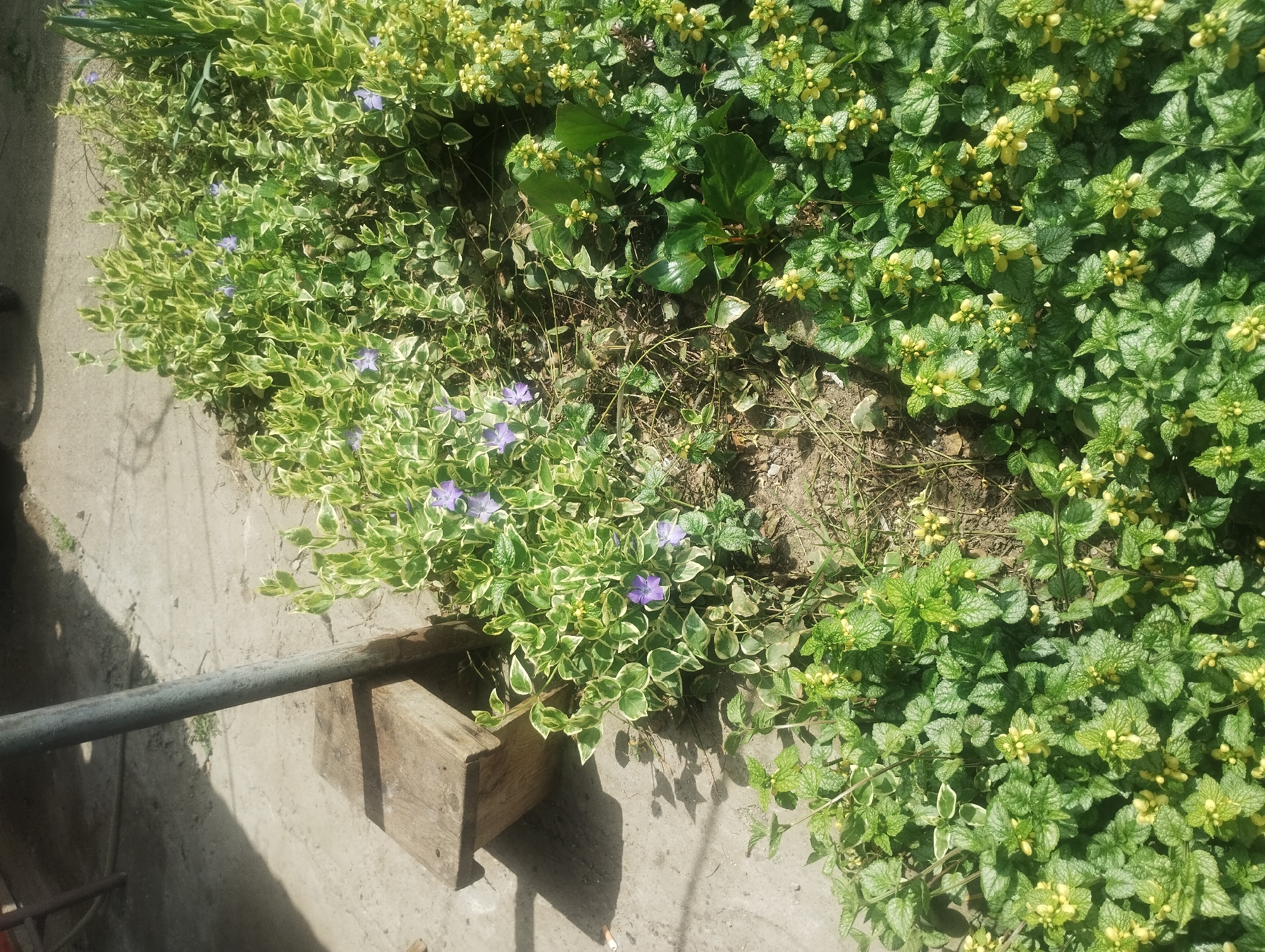 The image depicts a ground-level view of a garden bed in Knezha, Bulgaria. The garden bed contains several types of groundcover plants. On the left, there is variegated vinca minor (periwinkle) with visible blue flowers. Towards the right, there is a large patch of Lamium galeobdolon (yellow archangel). Some leaves of a bergenia plant are in the middle. The ground is visible in some areas, showing bare soil and dried leaves. A concrete surface is visible at the bottom left of the image, with a grey metal pole resting on a small wooden block. There are shadows on the concrete. The overall impression is one of an unkempt garden bed.