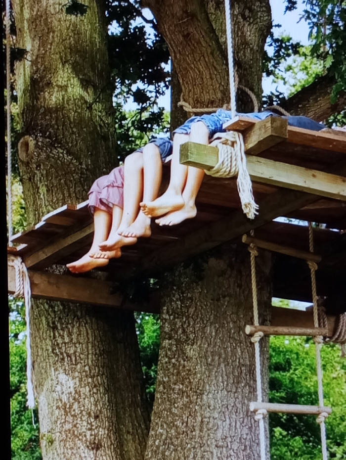 - "The image depicts an outdoor scene in Kichik Tasmachi, Uzbekistan, featuring a wooden treehouse platform supported by two large trees with textured bark" by FM-1o2DD3, licensed under CC BY 4.0