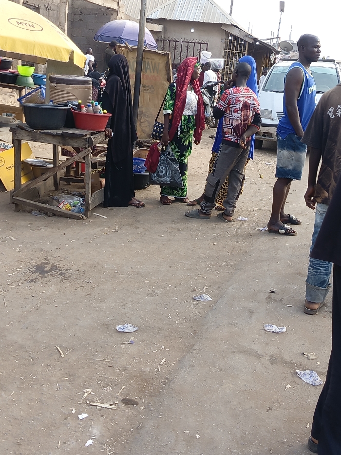 An outdoor scene depicts several people standing near a roadside stall beneath a yellow "MTN" umbrella. The stall displays various containers. A woman in a black robe and another in a colorful scarf are visible. Several men wear casual clothing. The ground is littered with debris, including what appears to be scattered pieces of white paper or trash. A white car is parked in the background.