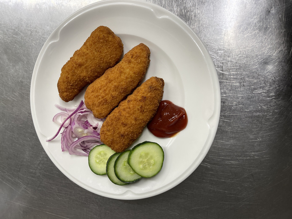 A white, oval-shaped plate containing a meal is positioned on a brushed metallic surface, likely stainless steel, exhibiting scuff marks and reflections consistent with a commercial kitchen environment. The exact location within Strasbourg, France, cannot be determined from the visual information provided. The plate holds three elongated, golden-brown, breaded, deep-fried food items, possibly fish sticks or croquettes, arranged diagonally from the upper right to the lower left. To the left of these items, four overlapping, circular slices of green cucumber are present. Above the cucumber and slightly to the left of the main food items, a small pile of thinly sliced red onion is visible. A dollop of red condiment, consistent with ketchup, rests below the central food item. No people are visible, and no active interactions are depicted; the scene shows a static food presentation.