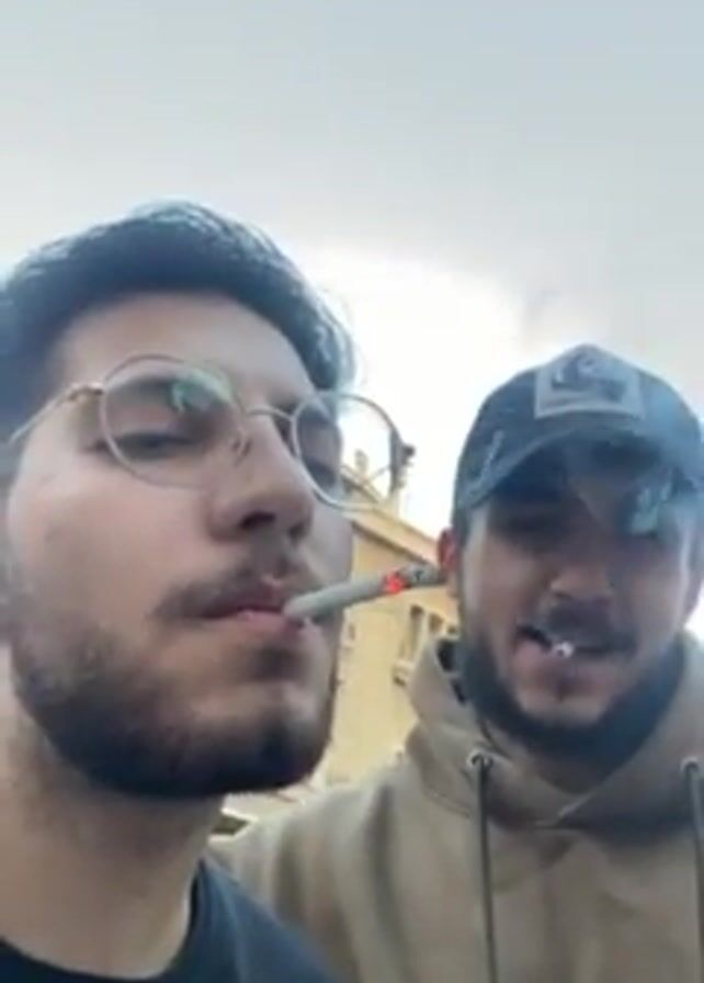 Two young men are standing close together outside, each with a cigarette in their mouth, partially visible in the frame