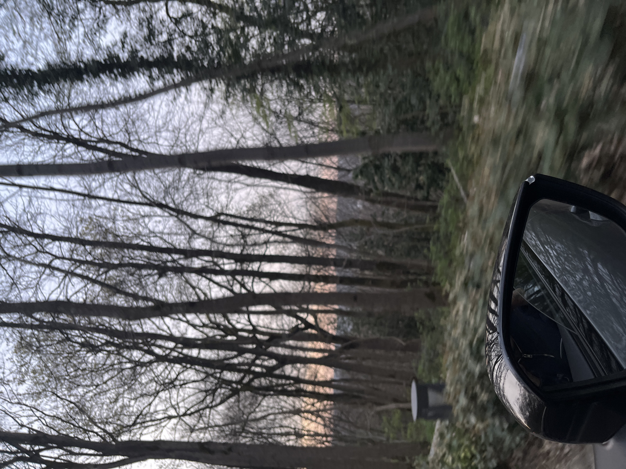 The image captures a perspective from a vehicle in motion through a wooded area in Gif-sur-Yvette, France, likely during dusk or dawn. The foreground on the left features a black exterior side mirror of a vehicle, reflecting a portion of the vehicle's light grey/silver body and an occupant inside wearing a dark blue garment with a visible zipper. Significant motion blur is present in the lower right and mid-ground foliage, indicating rapid movement. The scene beyond the vehicle consists of a dense forest or wooded hillside. Numerous tall, slender deciduous trees with bare branches dominate the view, suggesting late autumn, winter, or early spring. Interspersed among them are some evergreen trees, particularly on the far right and as ground cover. Beneath the trees, the ground is covered with thick green undergrowth, appearing as dense foliage. Towards the mid-left, partially obscured by the side mirror and foliage, a dark grey cylindrical trash receptacle with a lid is visible among the trees. The sky, seen through the tree canopy, exhibits a light grey-blue hue at the top, transitioning to soft pink and orange tones near the horizon, indicative of a low sun angle. No individuals are explicitly visible outside the vehicle in the main scene.