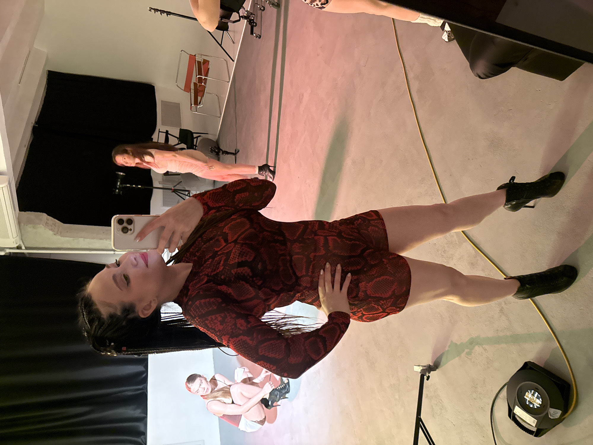 woman in a red patterned dress and black boots taking a selfie in what appears to be a photography studio