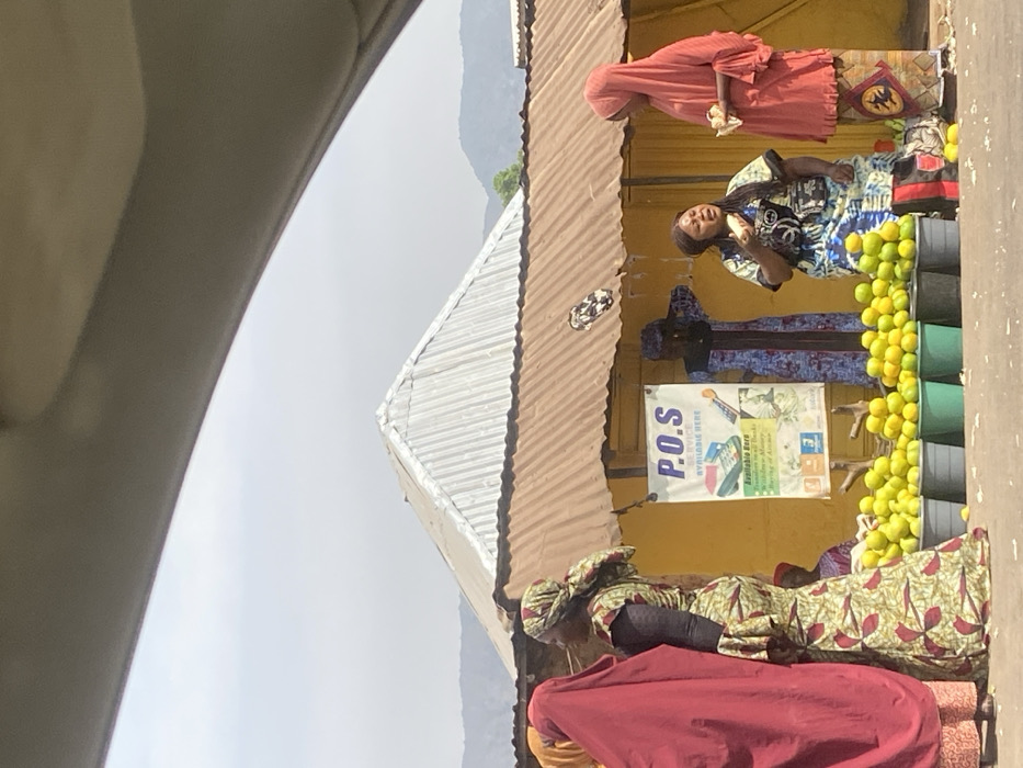 The image captures an outdoor street scene in Karshi, Nigeria, viewed from inside a vehicle, evident by the grey interior frame partially obscuring the top. In the mid-ground, five individuals are present around a fruit stall set against a single-story building with yellow walls and a brown corrugated metal roof. Numerous small, round, green and yellow citrus fruits are arranged in grey and green plastic buckets directly on the ground in front of the building. A white rectangular sign, prominently displayed on the building, states "P.O.S SERVICE AVAILABLE HERE" in blue text, with illustrations of a POS terminal, a mobile phone, and a hand with money. Additional text lists services such as "Deposit Money," "Withdrawal Money," "Payment of Bills," "Savings Account," and "Send & Receive Money," accompanied by "e," "3," and "f" logos. Among the individuals, from left to right: a person in a red garment, partially obscured; a woman in a long, fitted green, red, and black patterned dress with a matching headscarf and long black sleeves, standing; a person in a dark blue patterned garment, largely obscured by the P.O.S sign; a seated woman in a blue, white, and black patterned dress with a black fanny pack, holding a light-colored object to her mouth; and a standing woman in a light red/orange garment and patterned skirt, holding a similar light-colored object. A sixth individual in a red cap is partially visible behind the fruit display. The seated and standing women on the right appear to be interacting. The background reveals a hazy, light blue sky above distant, undulating hills. The ground surface appears unpaved.