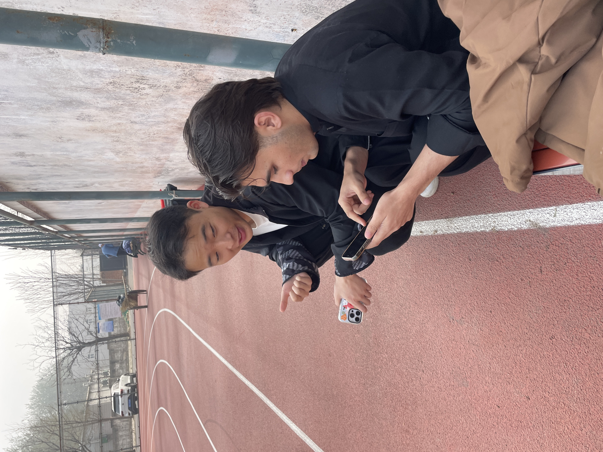 The image presents an outdoor scene within a sports facility, likely a running track, located in Daxing District, China. The conditions are overcast, suggesting diffuse lighting. In the foreground, two young adult males are squatting next to a reddish-brown synthetic running track marked with white lanes. Behind them is a weathered, light-colored wall. The male on the left, with dark hair and a light complexion, wears a black jacket featuring a patterned interior visible on the sleeves, over a white t-shirt. He holds a white-backed smartphone with a triple camera array in a clear case adorned with a red graphic in his left hand. His right hand is raised, open, and gestures towards the second male. His mouth is slightly open, indicating he may be speaking. The male on the right, with dark, swept-back hair and a medium complexion, wears a black long-sleeved tunic-style garment. He holds a black-backed smartphone with both hands, his right index finger touching the screen. His gaze is directed towards the phone screen. A brown jacket or similar fabric object rests on a red metal structure, possibly a bench, to his right. The two males appear to be engaged in a shared activity involving their smartphones. Beyond the immediate foreground, green metal poles, possibly part of a fence structure, are visible against the wall. A chain-link fence separates the track area from an external zone. In the mid-ground, beyond the fence, several bare trees and buildings are visible under the hazy sky. A white Volkswagen SUV is parked on a visible road. In the far background, a person dressed in blue pushes a small two-wheeled cart carrying a broom and other items, suggesting maintenance activity.
