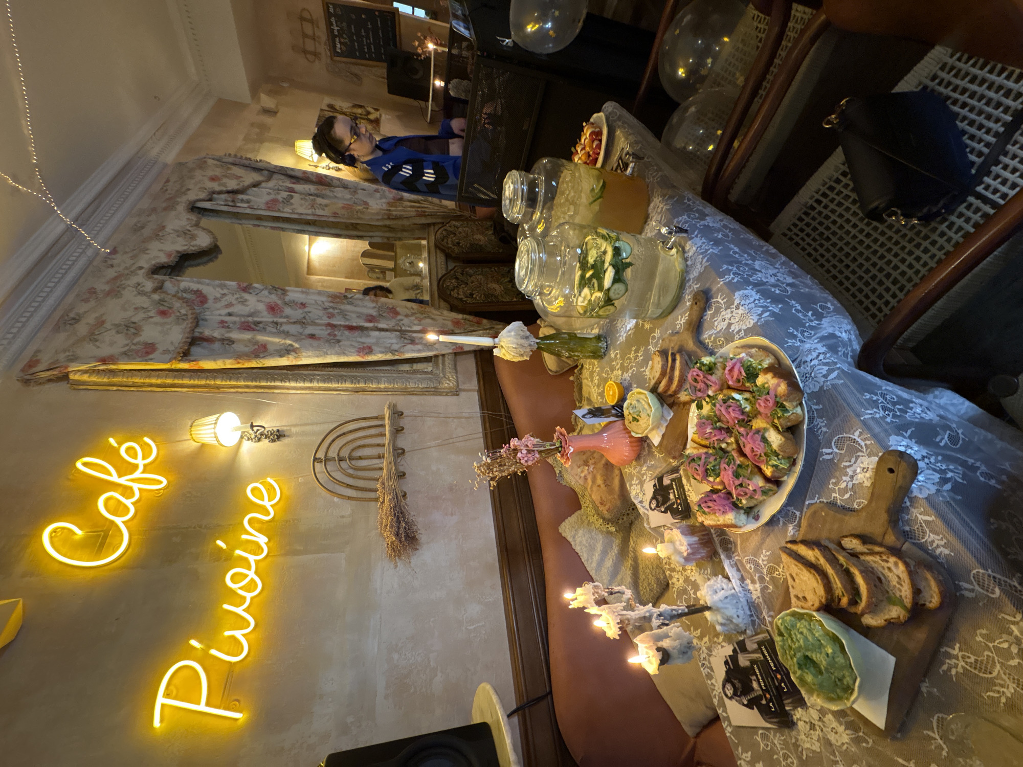 The scene depicts a stylish cafe or restaurant in Paris, France, evidenced by the neon sign reading "Café Pivoine." A buffet table is set up with glass beverage dispensers filled with water and fruits, along with plates of bruschetta and sliced bread served on wooden cutting boards. Decorative elements include candles, a flower arrangement, and balloons. In the background, a person wearing headphones and a blue cardigan is seen near a chalkboard, possibly operating as a DJ or musician. A vintage-style mirror with a floral frame and draped fabric reflects the interior. The overall ambiance suggests a celebratory event or a fashionable dining experience.