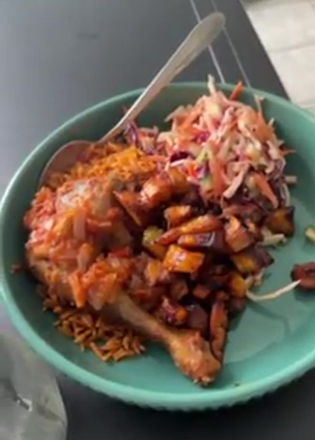 plate of food. The plate is green and contains jollof rice, chicken, plantains, and coleslaw. A spoon rests on top of the jollof rice and chicken. The plate is sitting on a black surface.