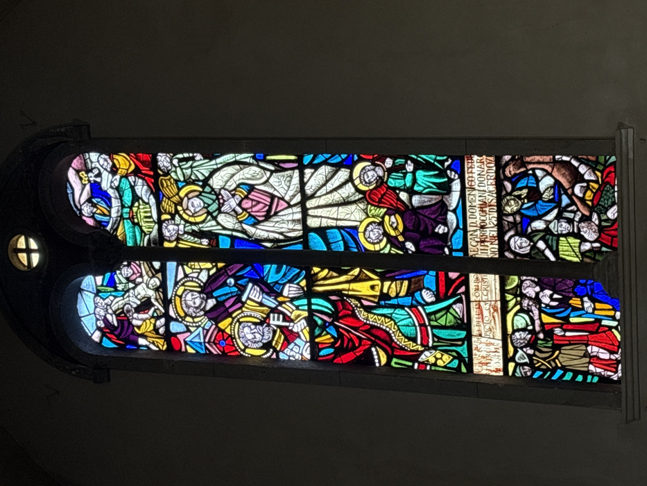 This image displays a tall, arched stained-glass window within a building located in the city of Foligno, Italy. The window is vertically divided into two main panels, with a smaller circular, multi-pane window featuring a cross motif positioned above. The surrounding wall is a plain, light gray. The stained-glass panels are vibrantly colored in blues, reds, greens, yellows, purples, oranges, and whites, depicting various religious scenes. **Left Vertical Panel:** * **Top section:** A chaotic scene with multiple figures, some struggling or carrying a horizontal figure, set against a backdrop of hills and architectural elements. Colors are predominantly red, blue, and yellow. * **Middle section:** Two standing male figures with halos are depicted. The figure on the left holds a large key and a book, while the figure on the right holds a book or tablet. Both wear layered robes in blues, reds, and gold. * **Bottom section:** A group of figures, some in red robes, others in blue and green, are shown interacting. One figure appears to be gesturing or addressing others. An inscription below this section is partially legible, including the word "CRISTI." **Right Vertical Panel:** * **Top section:** A central figure looks upwards, surrounded by several smaller, winged angelic figures with halos, against a background of blue and green. * **Middle section:** A tall, standing female figure in white robes with hands clasped in prayer is prominent, adorned with a halo. Below her, two smaller, seated angelic figures with halos and wings are depicted, one in purple and one in green. * **Bottom section:** This section shows multiple figures engaged in various actions. Some figures are in blue and green robes; one figure appears to be falling or interacting with a brown, animal-like form. An inscription is present above this section, partially reading: "AEGAN D. DOMENICO FEDE," "IL PARROCCHIANI DONA," and "NO NEL 25 D'SACERDOZ." Sunlight passes through the stained glass, illuminating the detailed figures and scenes with saturated colors, contrasting with the muted tone of the surrounding wall.
